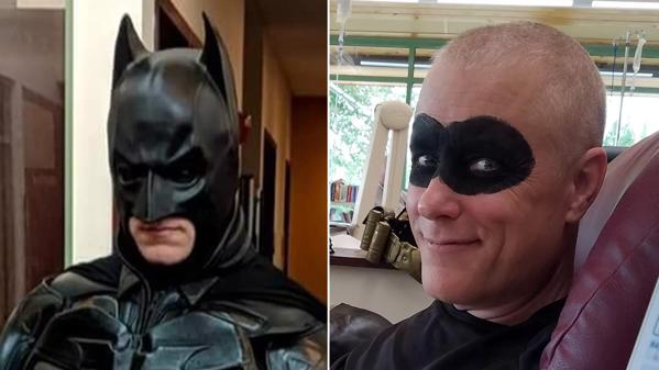 Patient Bruce Wayne dressed up as Batman during his last day of treatment at Cleveland Clinic’s Cancer Center in Sandusky, Ohio. (Courtesy: Bruce Wayne)